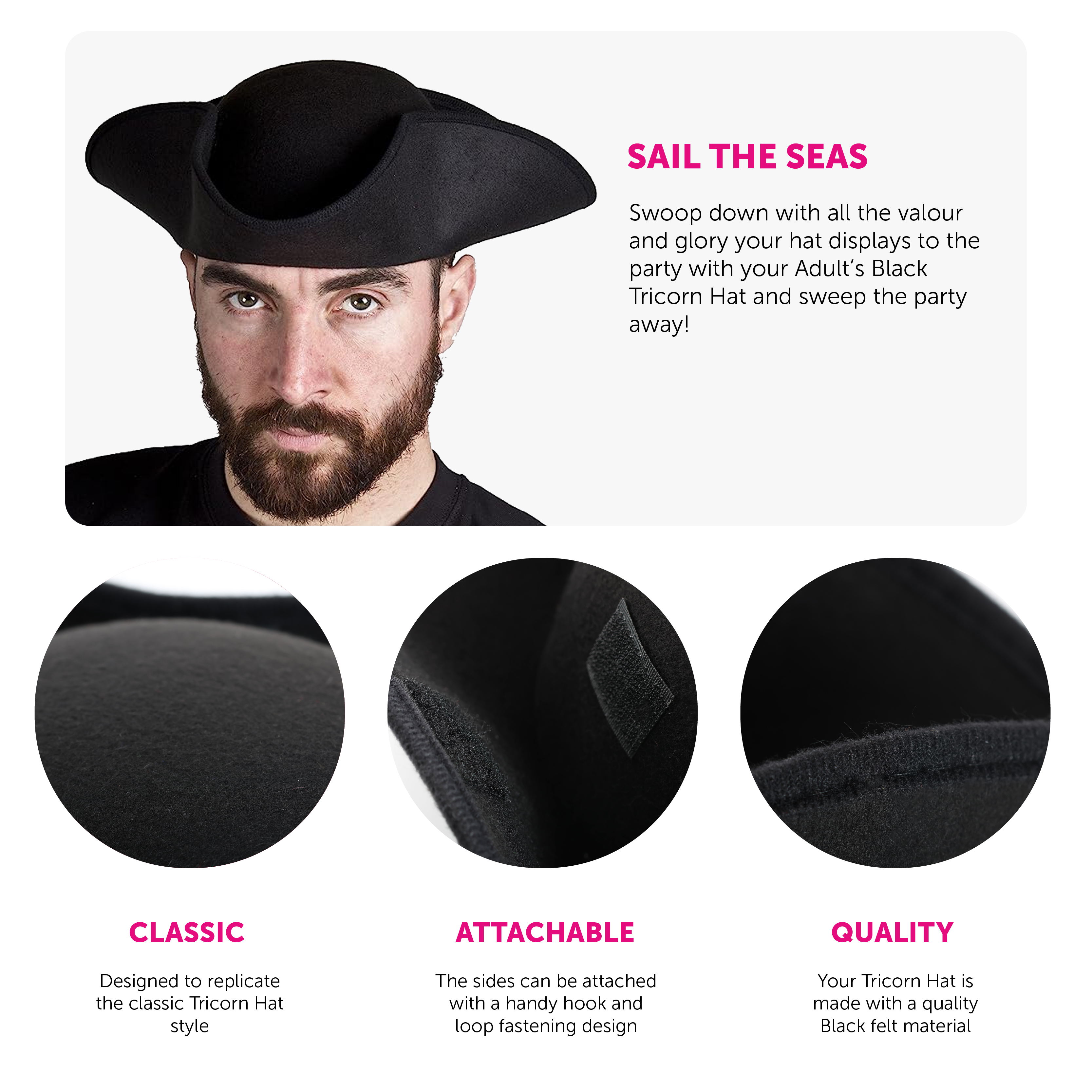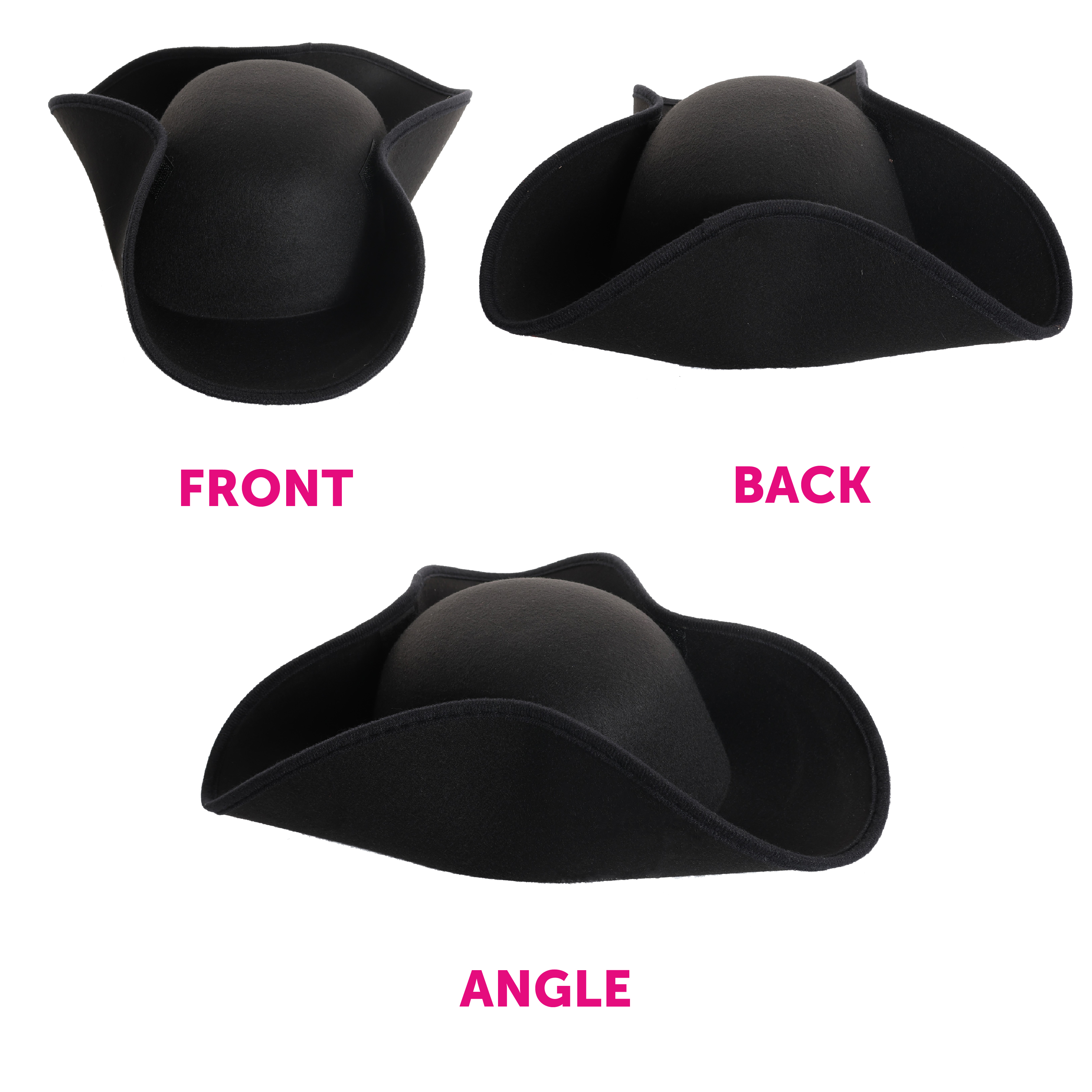 TRICORN HAT DETAILS: Your Adults Tricorn Hat features a 3-pointed Tricorn Hat, with a hook and loop sticking to collapse and extend the hat out for your different styles, made from a strong and durable felt material!