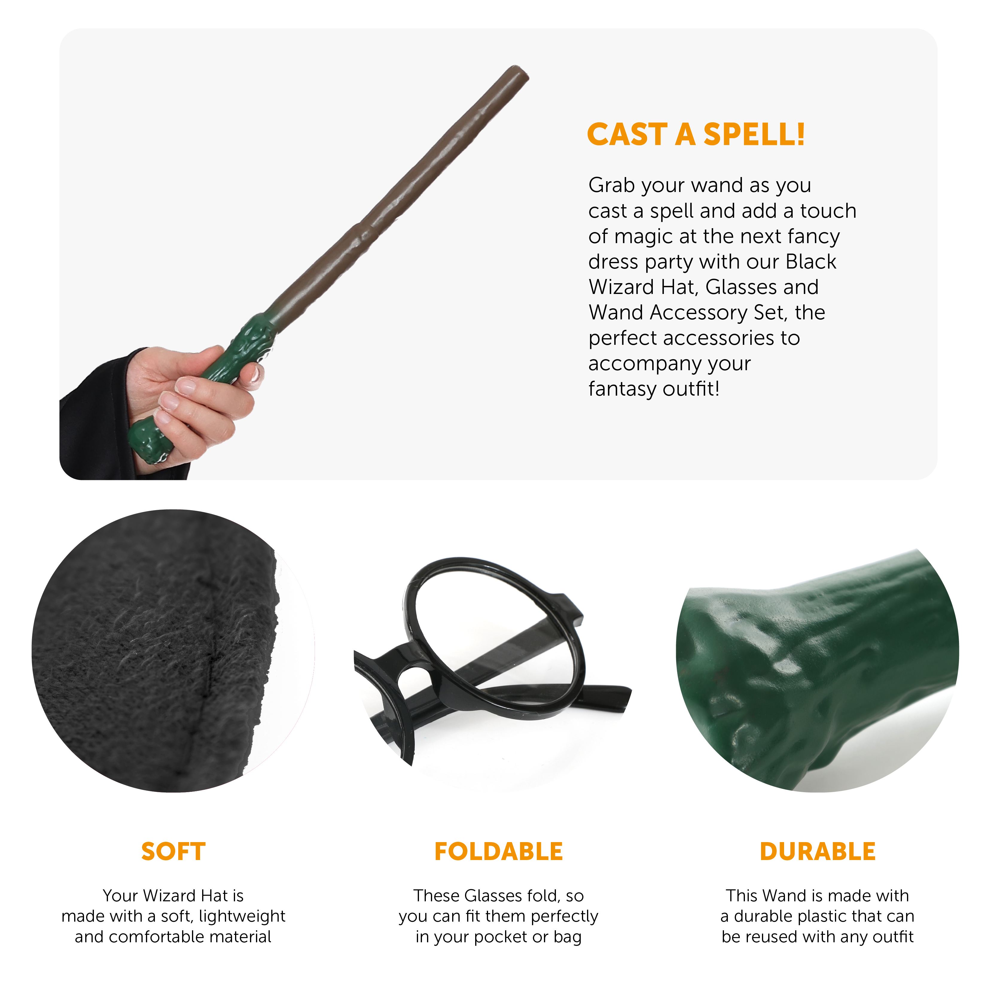 PERFECT FOR HALLOWEEN FANCY DRESS: Whether you're brewing a potion for Halloween or want that magical look at any other fancy dress event, there is no better accessory set than our Black Wizard Hat, Glasses and Wand!