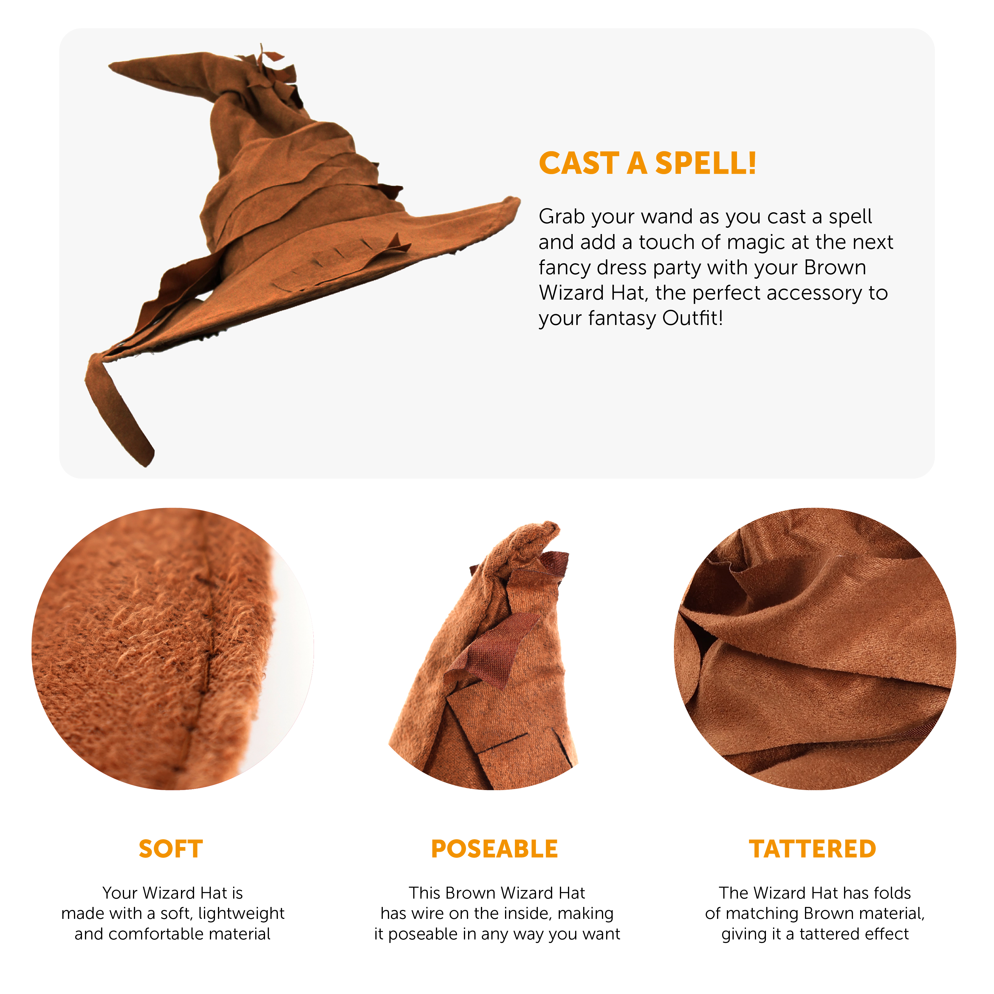 BROWN WIZARD HAT: Grab your wand as you cast a spell and add a touch of magic at the next fancy dress party with your Brown Wizard Hat, the perfect accessory to your fantasy Outfit!