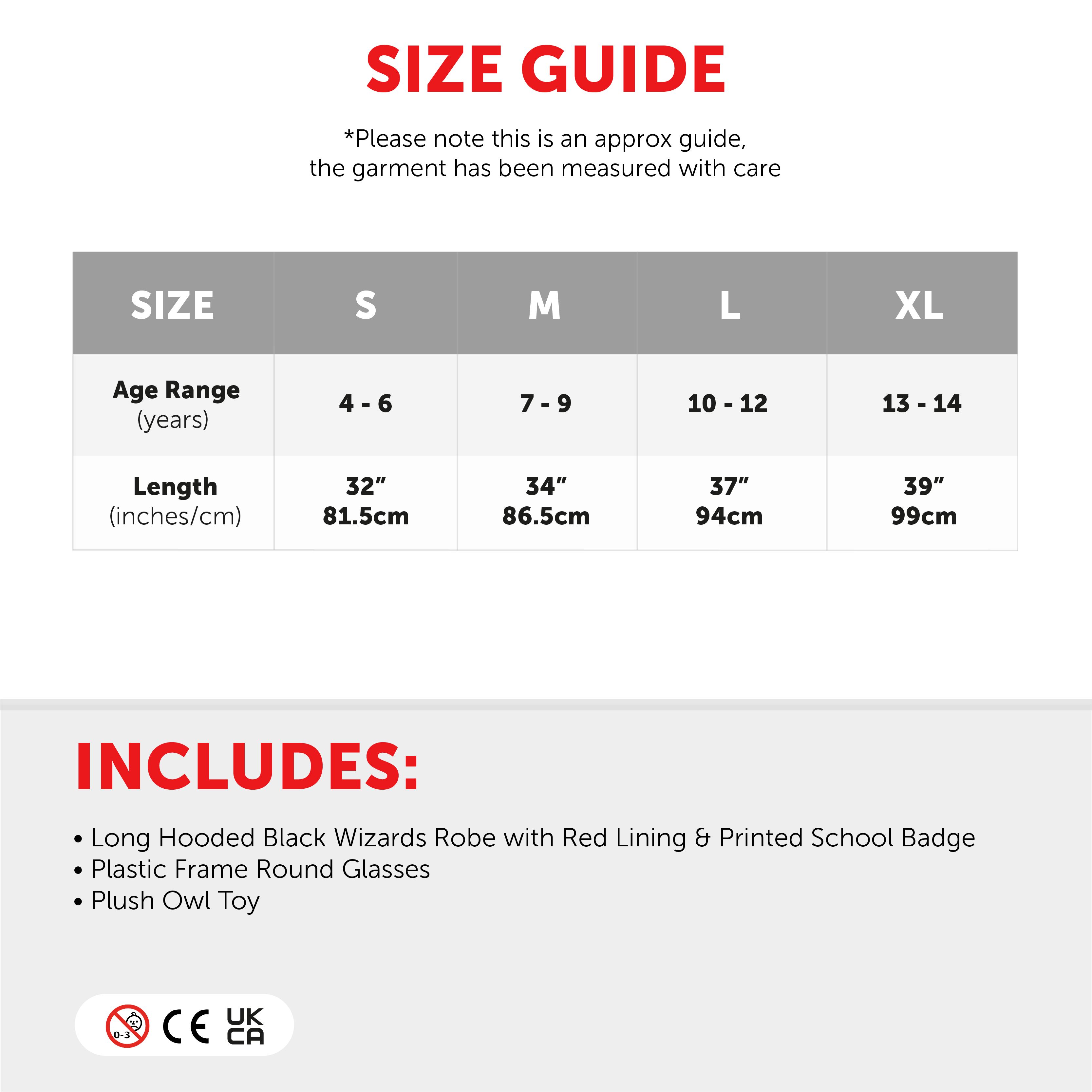 AVAILABLE IN MULTIPLE SIZES: Your Child’s Wizard Robe is available in multiple sizes from Small to X-Large: Small (4 - 6 years) Length 32" (81.5cm) | Medium (7 - 9 years) Length 34" (86.5cm) | Large (10 - 12 years) Length 37" (94cm) | X Large (13 - 14 years) Length 39" (99cm)