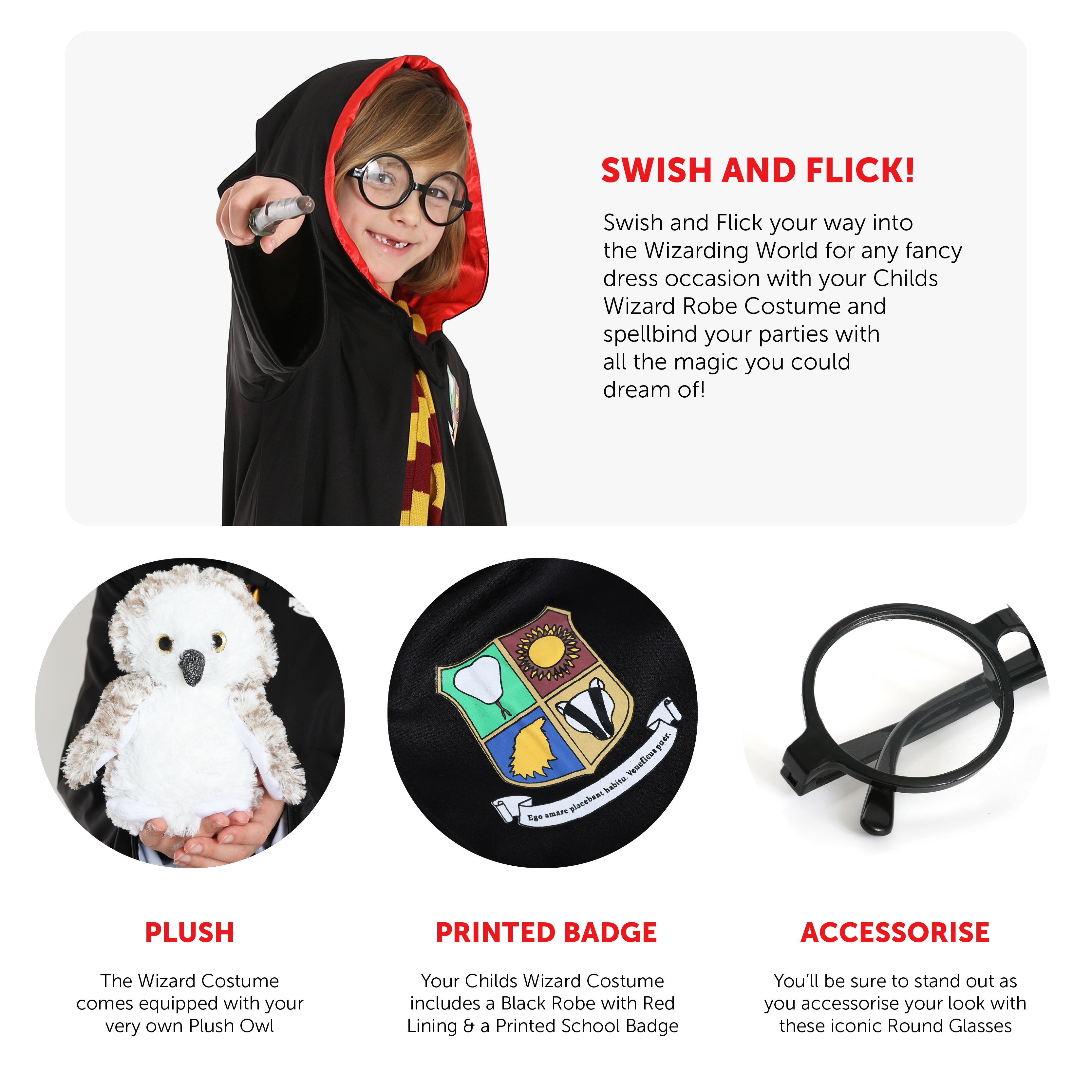 COSTUME DETAILS: Your Child’s Wizard Costume includes a Black Robe with Red Lining & a printed School Badge, Plastic Round Frame Glasses, and a Plush Owl, a classic and iconic look for all young aspiring Wizards to wear proudly!