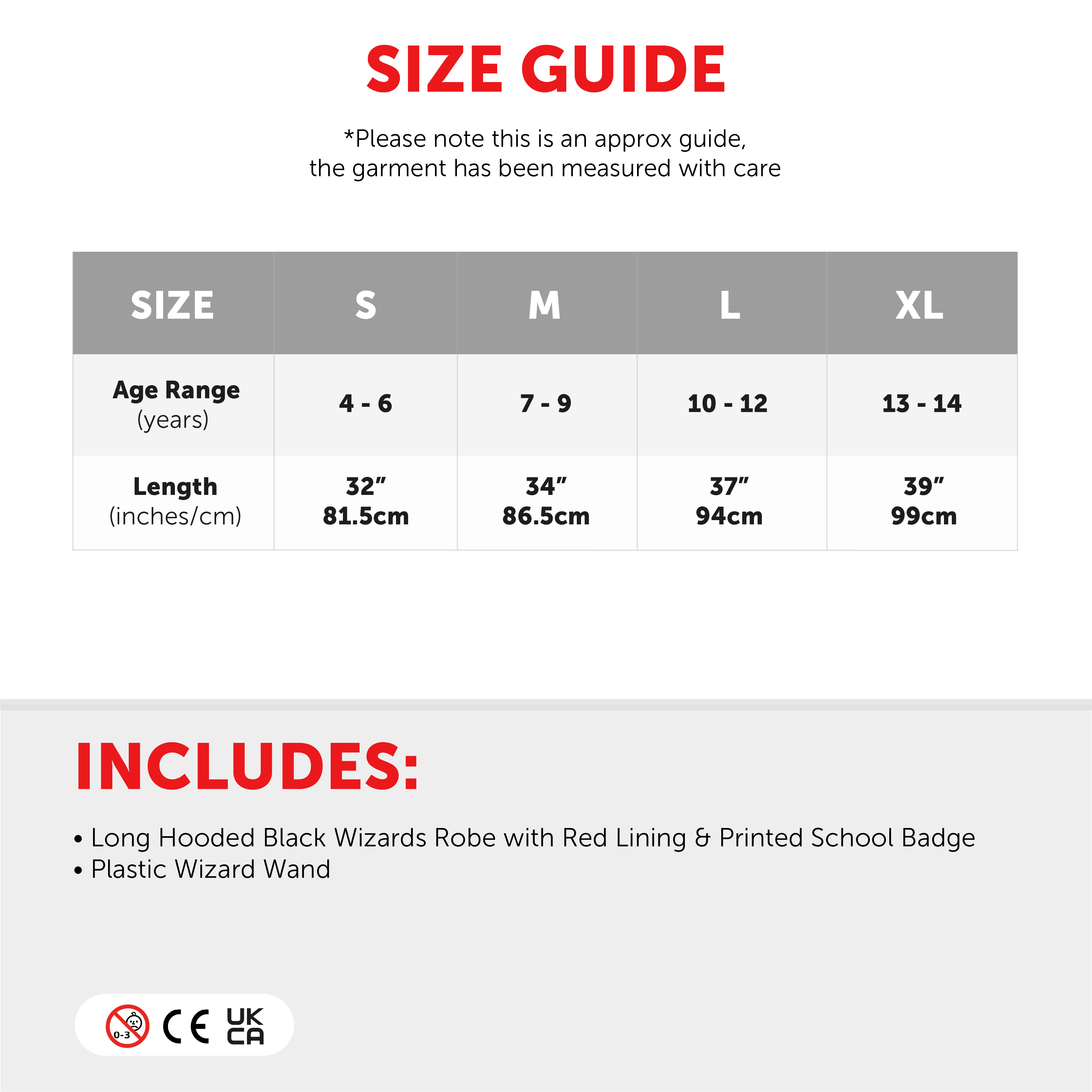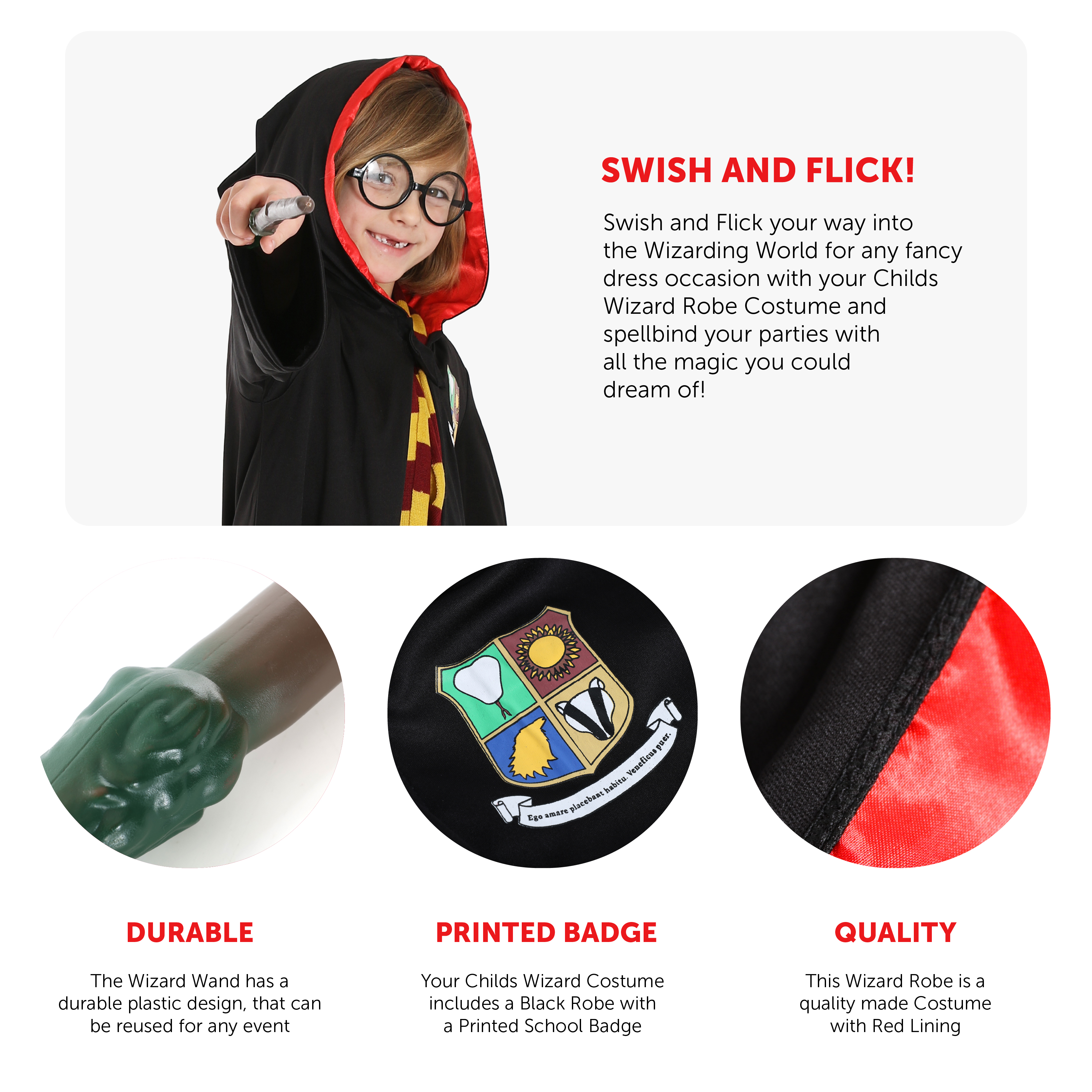 COSTUME DETAILS: Your Child’s Wizard Costume includes a Black Robe with Red Lining & a printed School Badge, and a Wizard Wand, a classic and iconic look for all young aspiring Wizards to wear proudly!