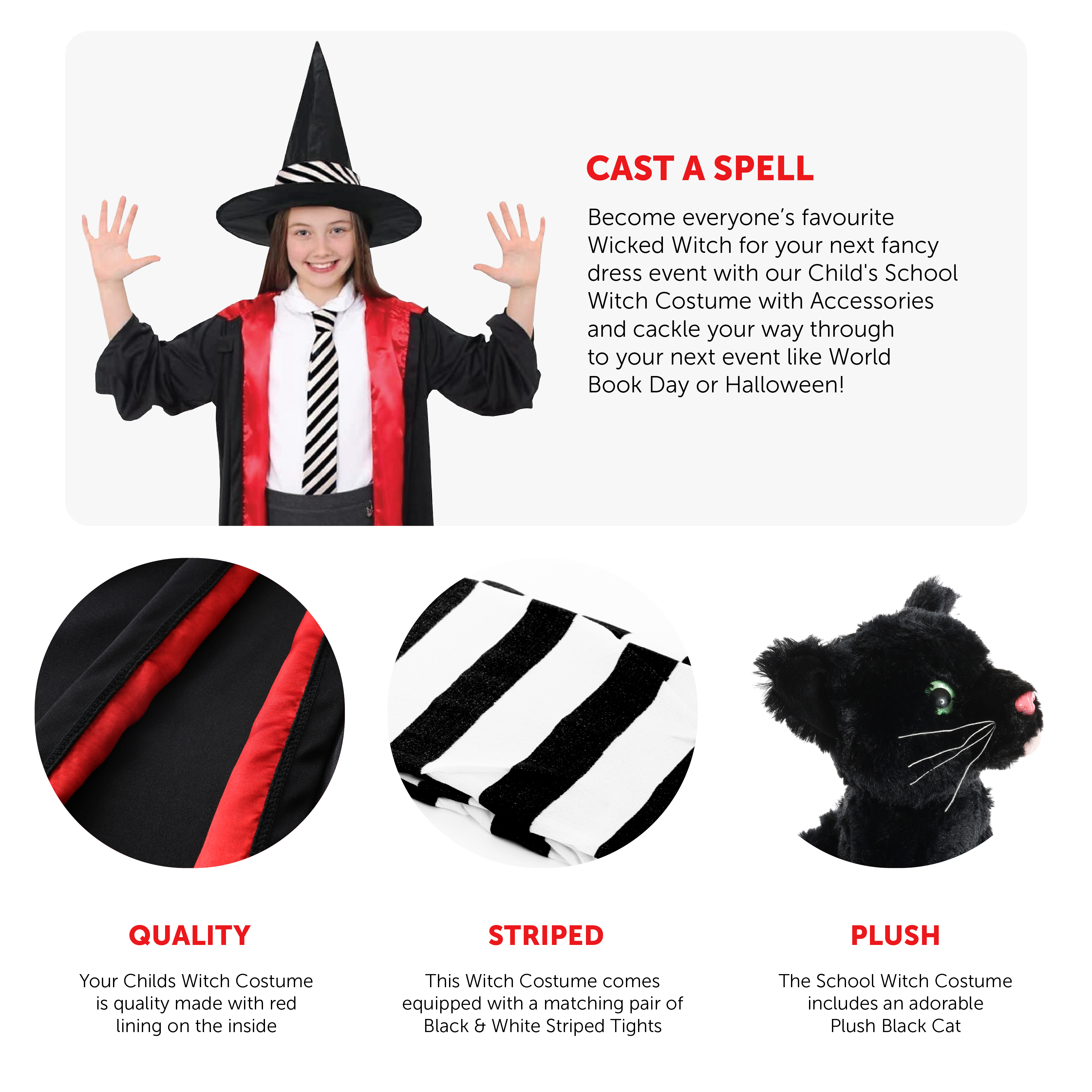 COSTUME INCLUDES: Your Child's School Witch Costume includes a Black Hooded Robe with Red Lining, a Black Witch Hat with Striped Band, a Black and White Striped Tie, a Plastic Wand, matching Black and White Striped Tights, and a Plush Black Cat to complete the look!