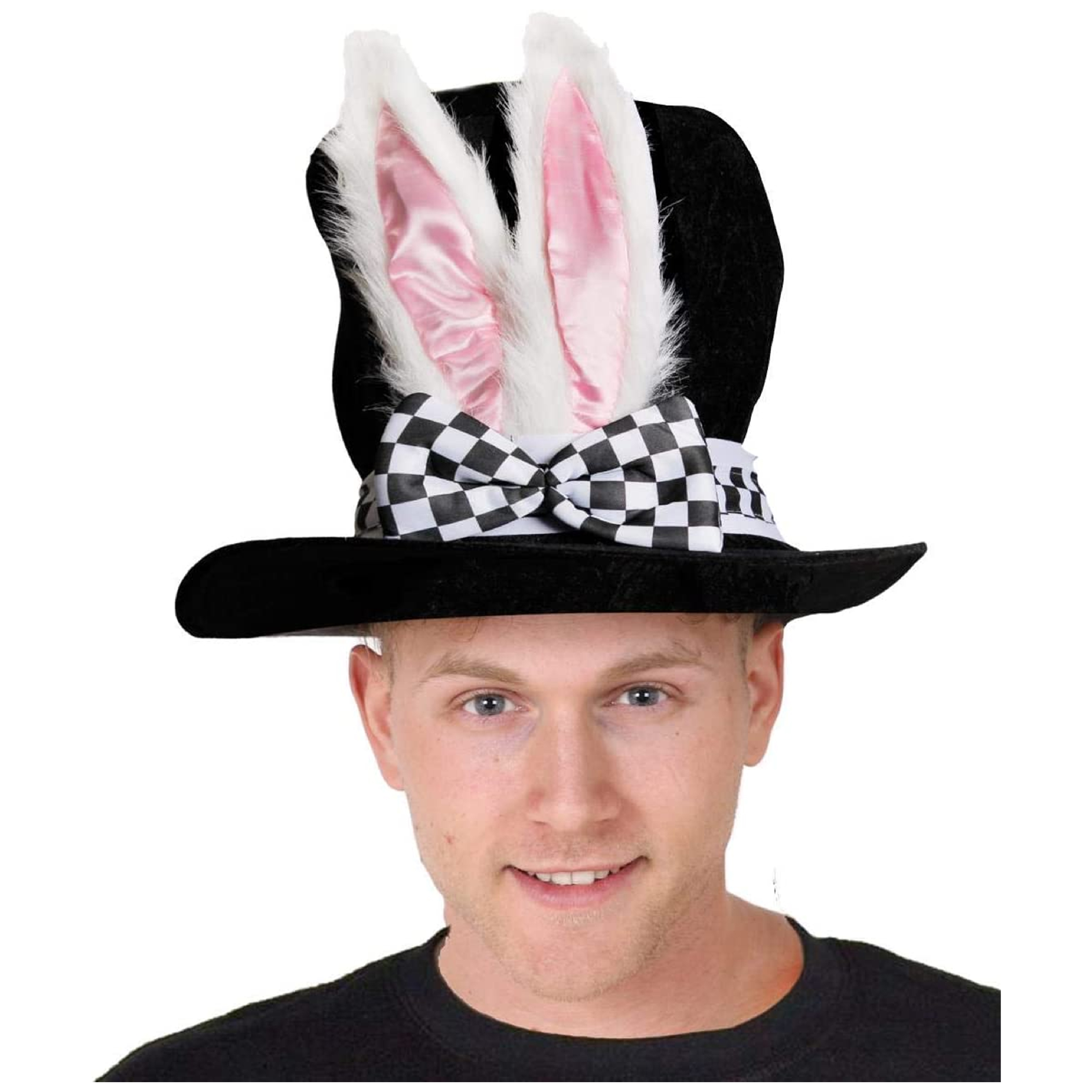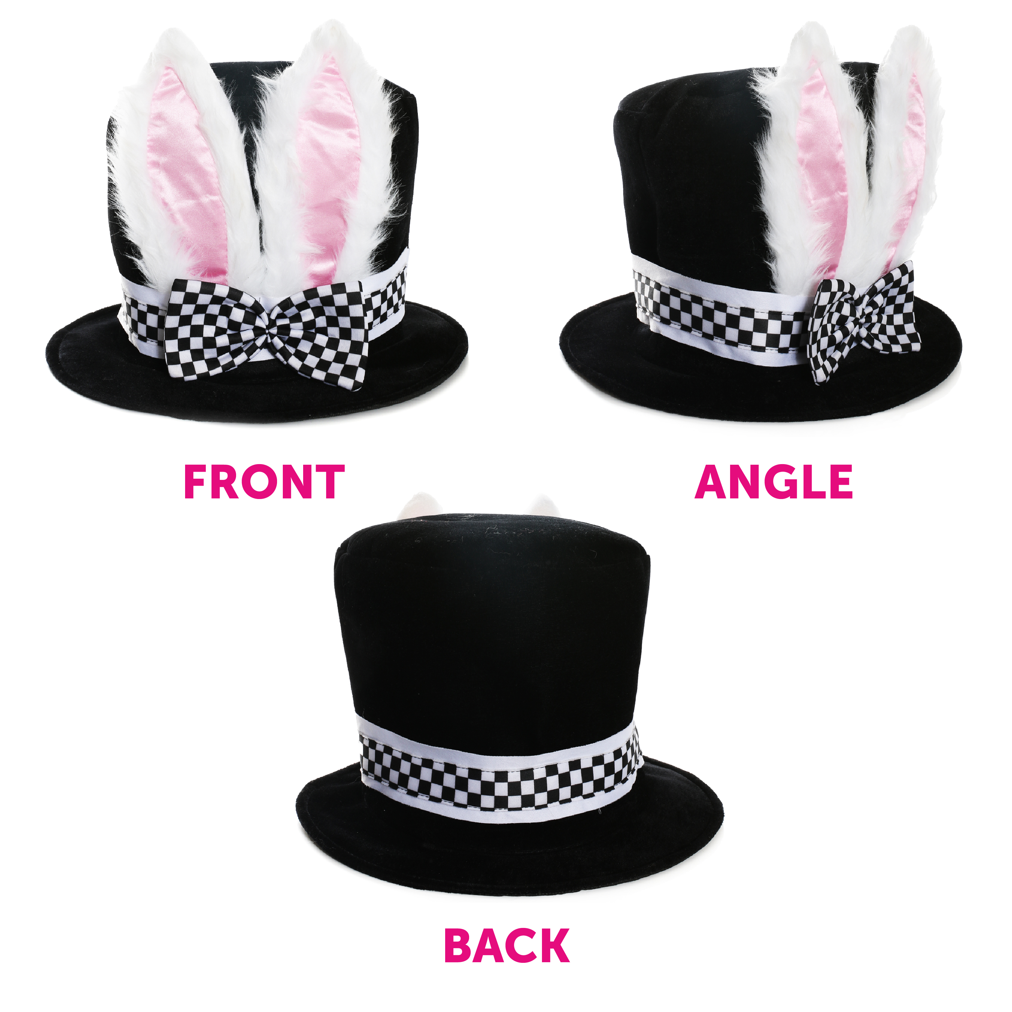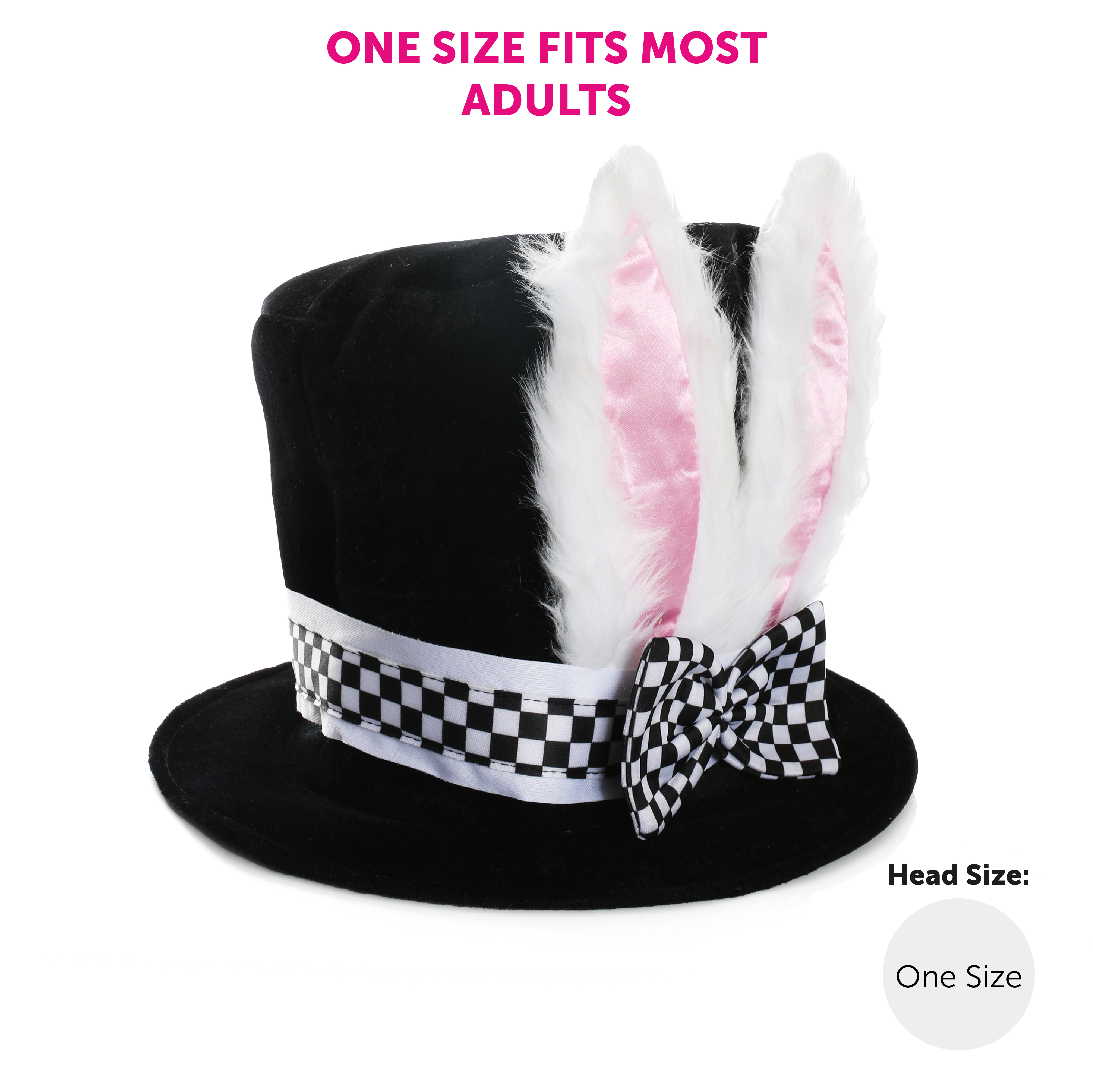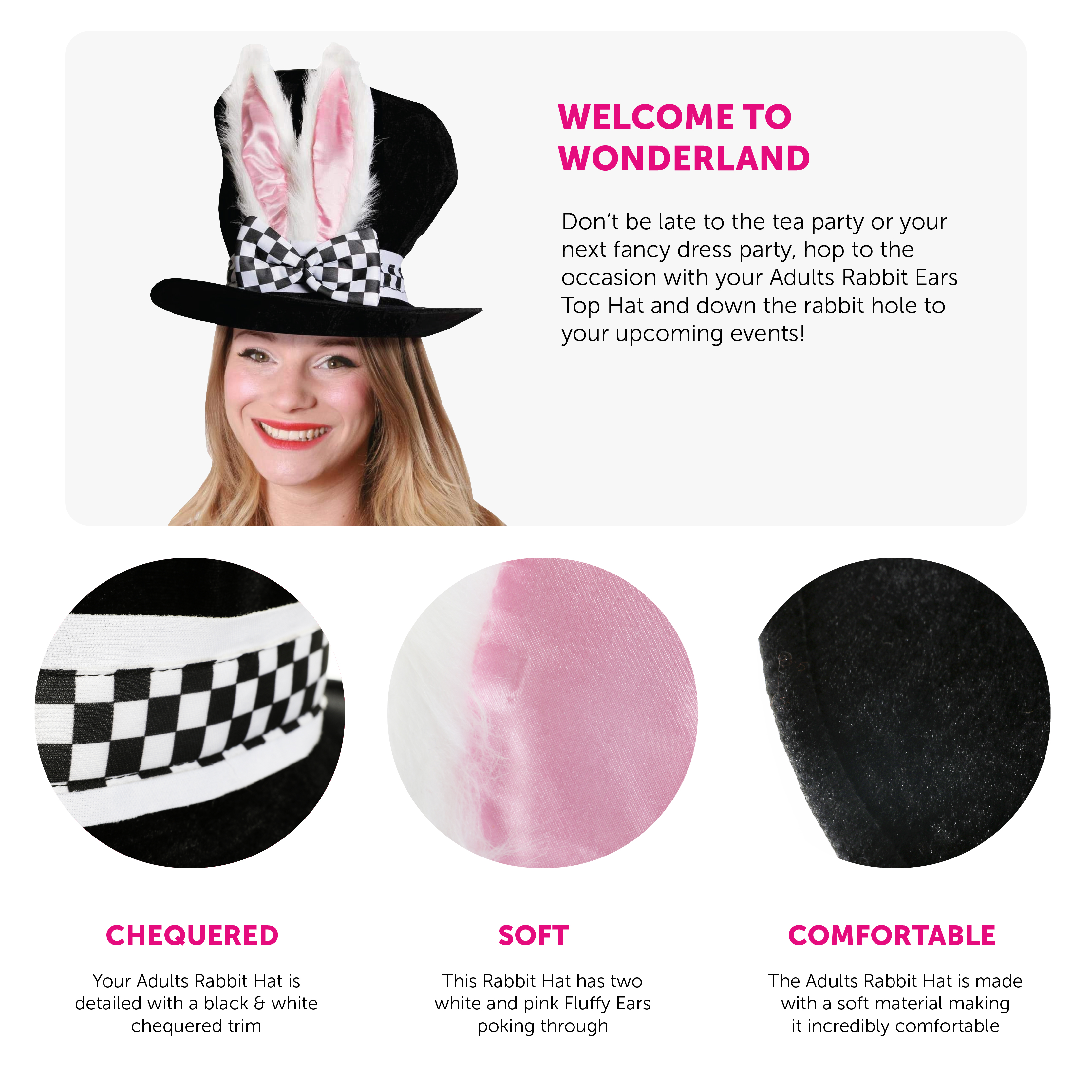 RABBIT EARS TOP HAT DETAILS: Your Adults Rabbit Ears Top Hat includes a plush Black Top Hat, with 2 White Rabbit ears atop the hat with a chequered bowtie that wraps around the crown of the hat!