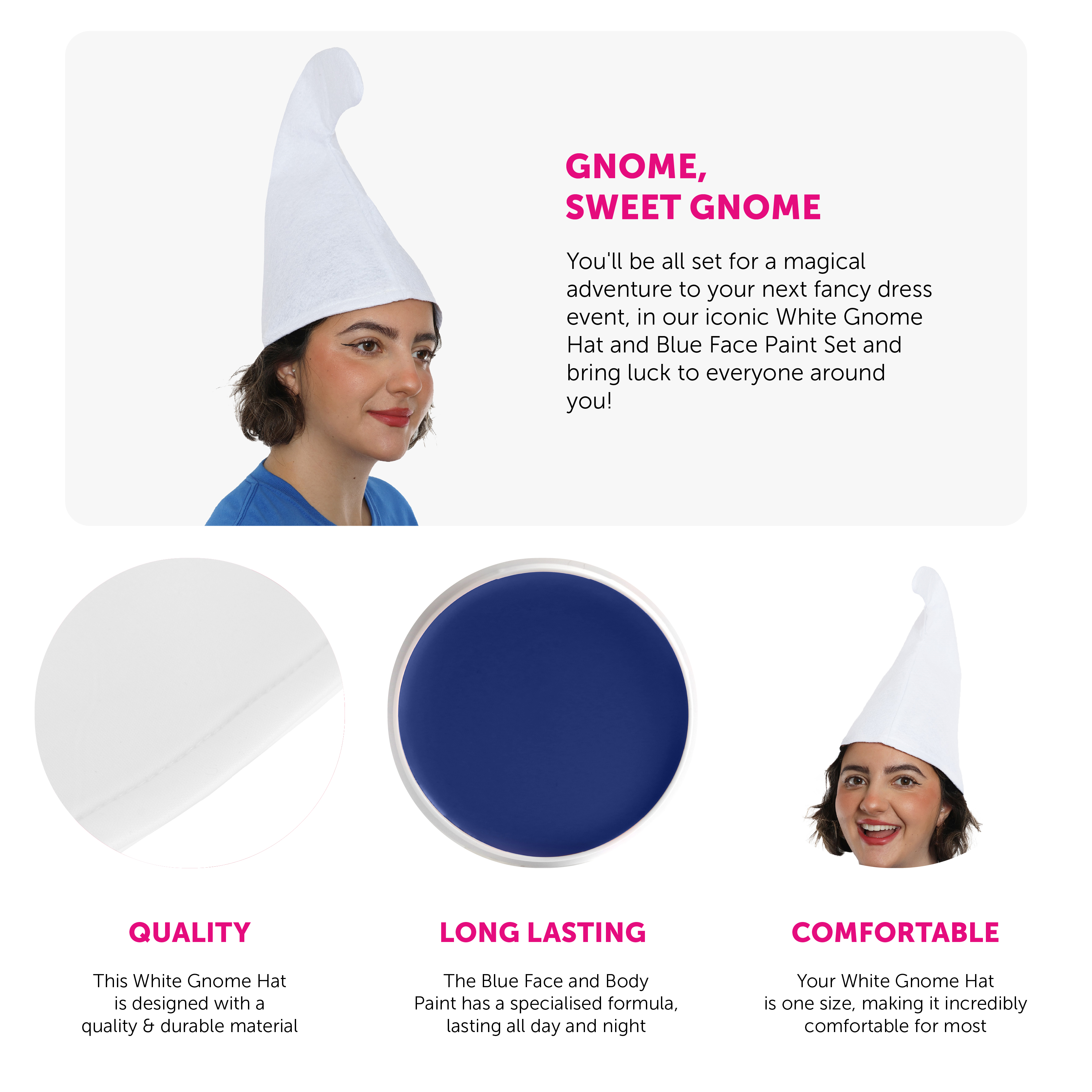 WHITE GNOME HAT & BLUE FACE PAINT: You'll be all set for a magical adventure to your next fancy dress event, in our iconic White Gnome Hat and Blue Face Paint Set and bring luck to everyone around you!